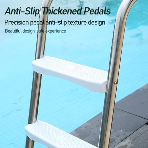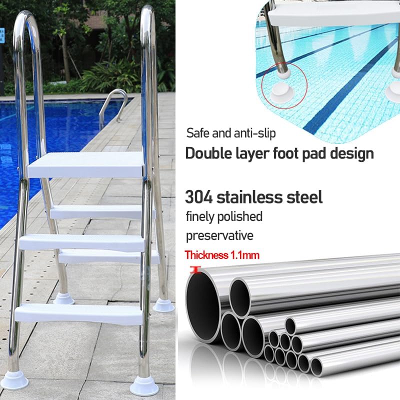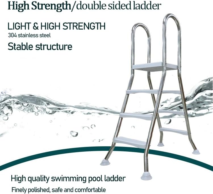 This ladder for above ground pools is designed for safety and durability, made from 304 stainless steel and ABS advanced plastic. It features a pipe diameter of 42mm and a stainless steel pipe wall thickness of 1.0mm, ensuring a maximum load capacity of 330-500 lbs. The double-sided design is suitable for outdoor swimming pools, offering convenience with its removable and easy-to-install features. The ladder comes in various heights to accommodate different pool depths: a 1.4-meter height for pools up to 0.83 meters, a 1.65-meter height for pools up to 1.08 meters, and a 1.9-meter height for pools up to 1.33 meters. Weighing between 14-20kg, it is both sturdy and manageable. The package includes 1 pool ladder, ready to enhance your swimming experience.