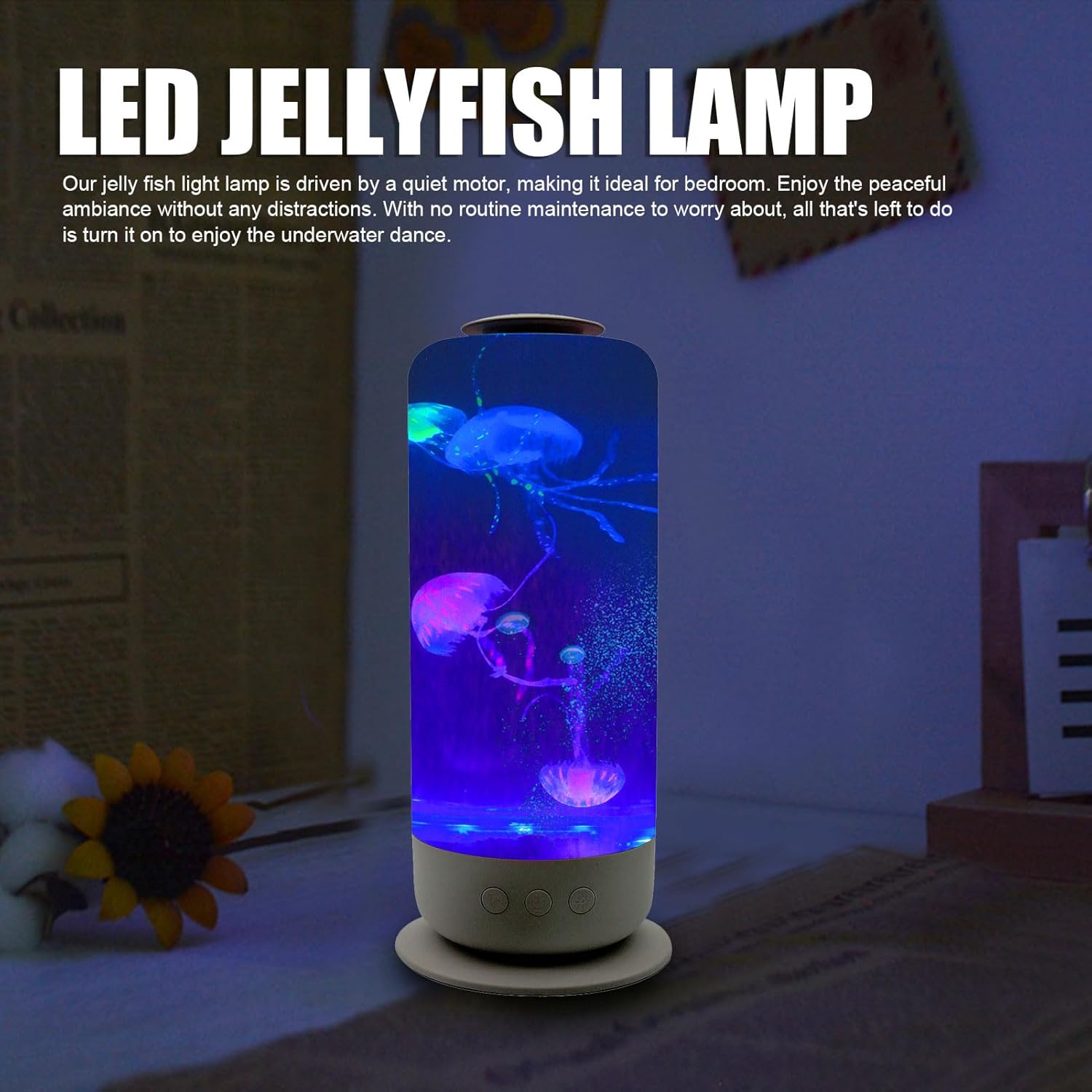 Spec: Item Type: LED Jelly fish Lamp Material: ABS, Acrylic Light Type: LED Power: 5W Power Input: Type C Water Speed: 3 Gears Motor: Quiet Brushless Motor Light Control Modes: Light Blue, Pink, Blue, Yellow, Green, Red, White, RGB Gradient Colors Application: for Home Decor How to Use: Directly use PackageList: 1 x LED Jelly fish Lamp 4 x Jelly fish 1 x Iron Rod 1 x Supply Cord 1 x User Manual 1 x Cover